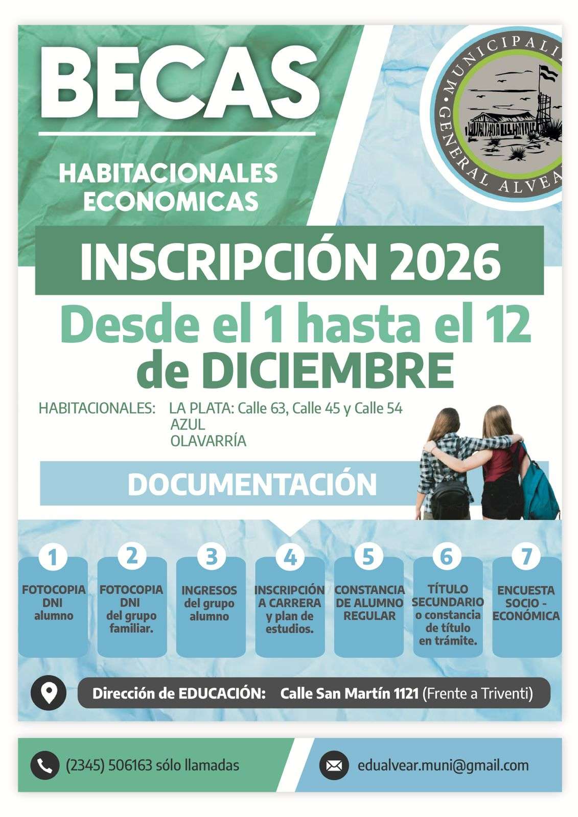 BECAS: HABITACIONALES ECONOMICAS INSCRIPCIÓN 2026: Desde el 1 hasta el 12 de DICIEMBRE HABITACIONALES: LA PLATA: Calle 63, Calle 45 y Calle 54 AZUL OLAVARRÍA DOCUMENTACIÓN Consultas en Dirección de EDUCACIÓN: Calle San Martín 1121 (Frente a Triventi) – (2345) 506163 sólo llamadas – edualvear.muni@gmail.com Spread the love