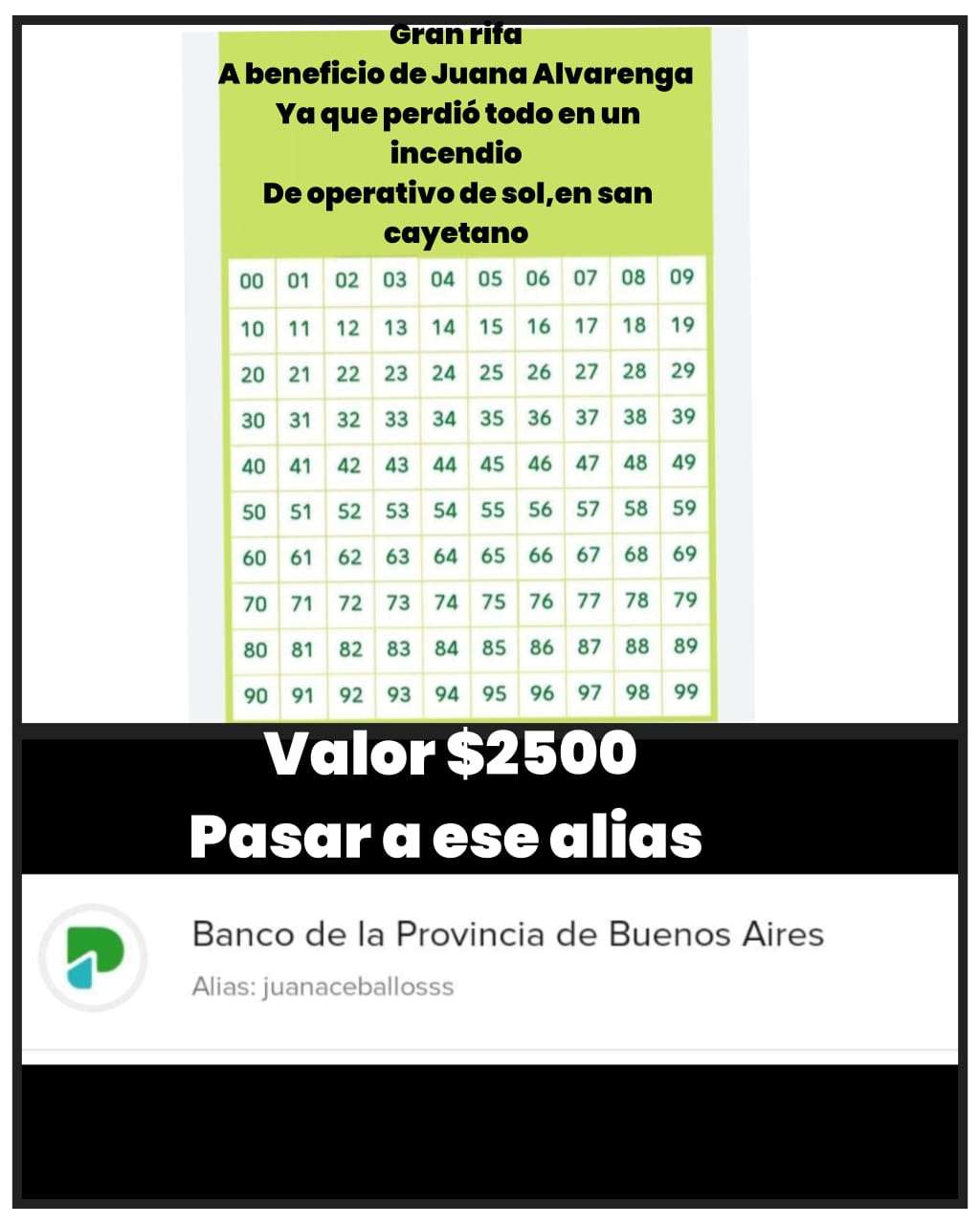 Una Joven Alvearense necesita Nuestra Ayuda Se trata de la Joven Juana Alvarenga Merlo, quien el pasado mes de diciembre se recibió de Oficial de Policía y hoy se encuentra en la localidad de San Cayetano (Partido de la Costa) cumpliendo funciones en el Operativo Sol 2026, y lamentablemente hoy alrededor de las 14 hrs sufrió un incendio en el domicilio que alquila en dicha ciudad, y como resultado perdió todas sus pertenencias, hasta el dinero que había retirado del banco para abonar el alquiler del mismo.- En cuánto a su estado de Salud ella no sufrió ningún tipo de lesiones ni quemaduras y debe continuar trabjaando en la localidad balnearia hasta el mes de marzo.- Ante tal fatal siniestro, familiares y amigos realizaron una colecta y una rifa para poder colaborar con sus gastos y adquirir un nuevo alquiler, como tambien ropa, dado a las perdidas totales que sufriera.- Quienes desean, puede comprar un número con un valor de $ 2500 pesos o realizar la colaboración y/o aportes que deseen al alias: juanaceballosss y enviar el comprobante del pago al celular 2345 68-3298 (abuela Norma).- Desde la Familia agradecen a la Población por su gesto de colaboración.- Spread the love