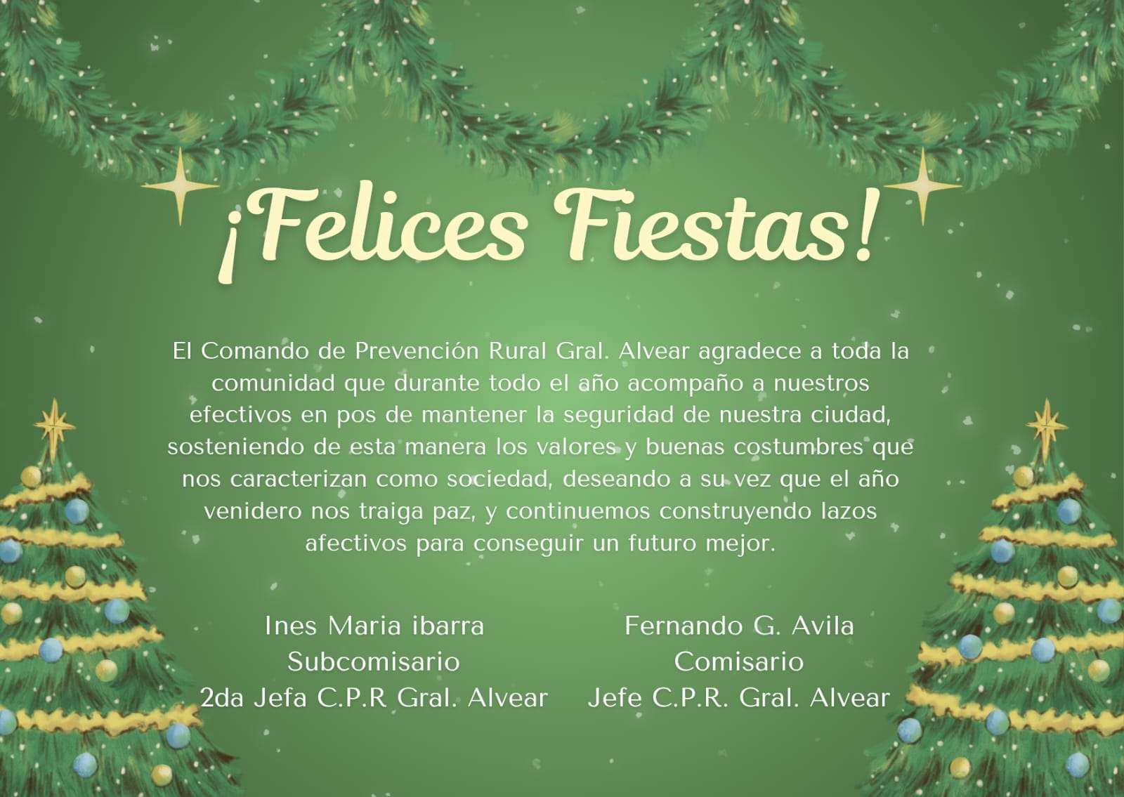 Saludos Navideños del Comando de Prevención Rural El Comando de Prevención Rural Gral. Alvear agradece a toda la comunidad que durante todo el año acompaño a nuestros efectivos en pos de mantener la seguridad de nuestra ciudad, sosteniendo de esta manera los valores y buenas costumbres que nos caracterizan como sociedad, deseando a su vez que el año venidero nos traiga paz, y continuemos construyendo lazos afectivos para conseguir un futuro mejor. Ines Maria ibarra Subcomisario 2da Jefa C.P.R Gral. Alvear Fernando G. Avila Comisario Jefe C.P.R. Gral. Alvear Spread the love
