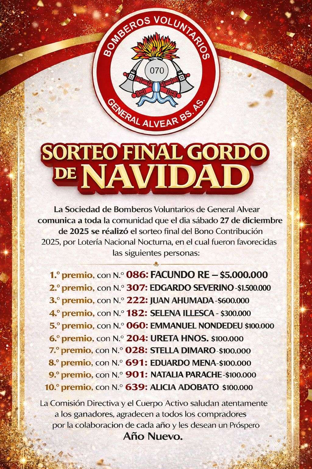 SORTEO FINAL GORDO DE NAVIDAD La Sociedad de Bomberos Voluntarios de General Alvear comunica a toda la comunidad que el dia sábado 27 de diciembre de 2025 se réalizó el sorteo final del Bono Contribución 2025, por Lotería Nacional Nocturna, en el cual fueron favorecidas las siguientes personas: 1.º premio, con N.º 086: FACUNDO RE – $5.000.000 2.º premio, con N.º 307: EDGARDO SEVERINO-$1.500.000 3.º premio, con N.º 222: JUAN AHUMADA-$600.000 4.º premio, con N.º 182: SELENA ILLESCA – $300.000 5.º premio, con N.º 060: EMMANUEL NONDEDEU $100.000 6.º premio, con N.º 204: URETA HNOS. $100.000 7.º premio, con N.° 028: STELLA DIMARO-$100.000 8.º premio, con N.º 691: EDUARDO MENA-$100.000 9.º premio, con N.º 901: NATALIA PARACHE-$100.000 10.º premio, con N.º 639: ALICIA ADOBATO $100.000 La Comisión Directiva y el Cuerpo Activo saludan atentamente a los ganadores, agradecen a todos los compradores por la colaboracion de cada año y les desean un Próspero Año Nuevo. Spread the love