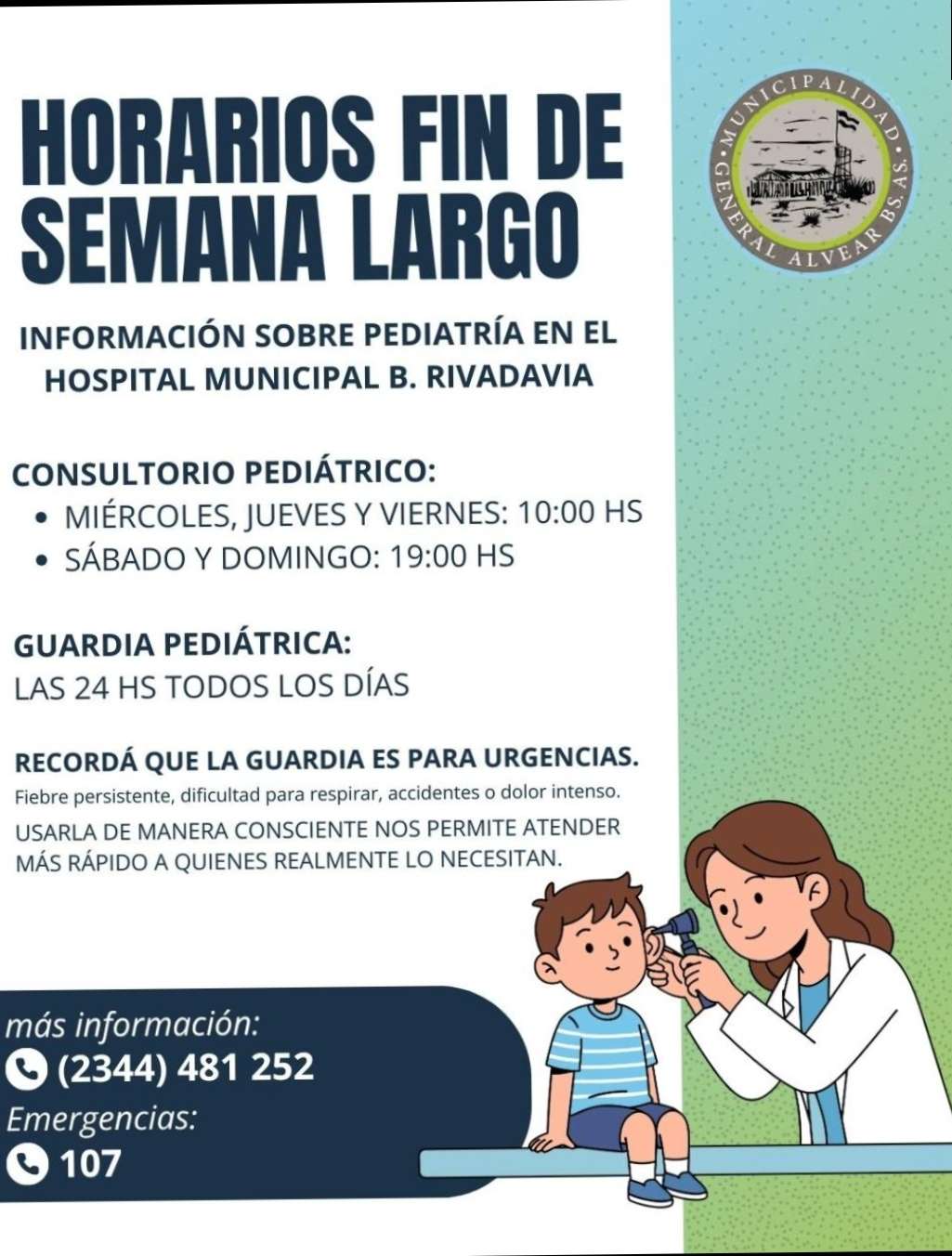 INFORMACIÓN SOBRE PEDIATRÍA EN EL HOSPITAL MUNICIPAL B. RIVADAVIA PARA EL FIN DE SEMANA LARGO HORARIOS FIN DE SEMANA LARGO INFORMACIÓN SOBRE PEDIATRÍA EN EL HOSPITAL MUNICIPAL B. RIVADAVIA CONSULTORIO PEDIÁTRICO: MIÉRCOLES, JUEVES Y VIERNES: 10:00 HS SÁBADO Y DOMINGO: 19:00 HS GUARDIA PEDIÁTRICA: LAS 24 HS TODOS LOS DÍAS RECORDÁ QUE LA GUARDIA ES PARA URGENCIAS. Fiebre persistente, dificultad para respirar, accidentes o dolor intenso. USARLA DE MANERA CONSCIENTE NOS PERMITE ATENDER MÁS RÁPIDO A QUIENES REALMENTE LO NECESITAN. más información: (2344) 481 252 – Emergencias: 107 Spread the love