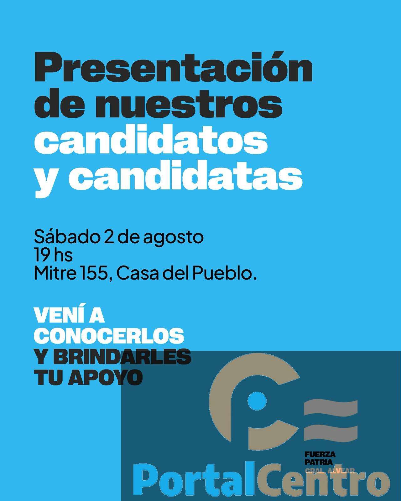 FUERZA PATRIA PRESENTA A SUS CANDIDATOS El Partido Justicialista de General Alvear invita a Ud./uds. a la presentación de la lista de Candidatas y candidatos a Concejales y Consejeros escolares de Fuerza Patria. La misma se realizará el día sábado 2 de agosto a las 19 horas en la Casa del Pueblo. Esperamos contar con su grata presencia. Spread the love