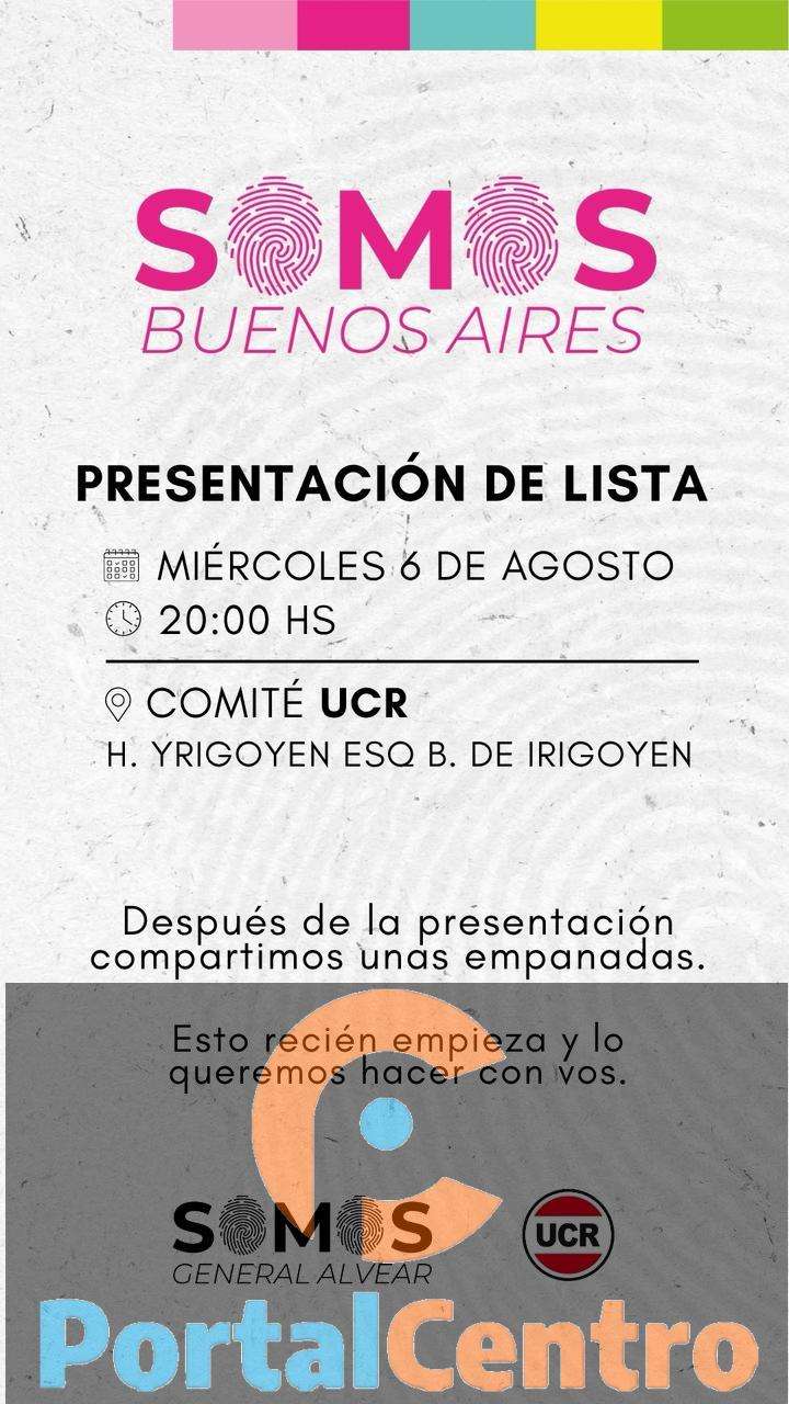 SOMOS BUENOS AIRES PRESENTA SU LISTA PRESENTACIÓN DE LISTA MIÉRCOLES 6 DE AGOSTO 20:00 HS COMITÉ UCR H. YRIGOYEN ESQ B. DE IRIGOYEN Después de la presentación compartimos unas empanadas. Esto recién empieza y lo queremos hacer con vos. Spread the love