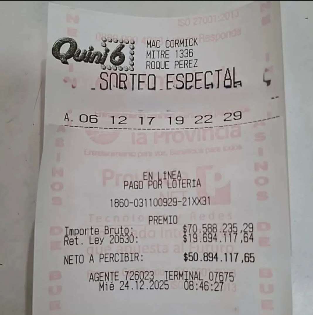 La suerte sonrió en Roque Pérez: dos ganadoras del Quini 6 Dos vecinas de Roque Pérez se convirtieron este domingo 21 en ganadoras de un pozo millonario del Quini 6, tras acertar una jugada realizada en la Agencia Candilejas. Se trató de una boleta de números fijos, que venía jugándose de manera mensual desde hace tiempo. Originalmente, la jugada era compartida por cinco amigas, pero en este último mes solo dos de ellas continuaron participando, lo que derivó en la curiosa postal del sorteo: dos ganadoras y tres arrepentidas.El premio total asciende a 70 millones de pesos, y luego de los descuentos correspondientes, las afortunadas percibirán $50.849.117,65. En tanto, desde la Lotería de Santa Fe informaron que para el Sorteo Especial Navideño, que se realizará este miércoles a las 19 horas, se estima un pozo acumulado de $6.700 millones de pesos. ✨ ¡Felicitaciones a las ganadoras! Spread the love
