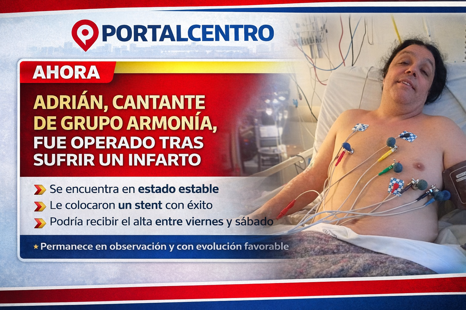 El cantante de Grupo Armonía, Adrián, sufrió un infarto en la madrugada del pasado domingo en la ciudad de Monte y actualmente se encuentra en estado estable, con evolución favorable.