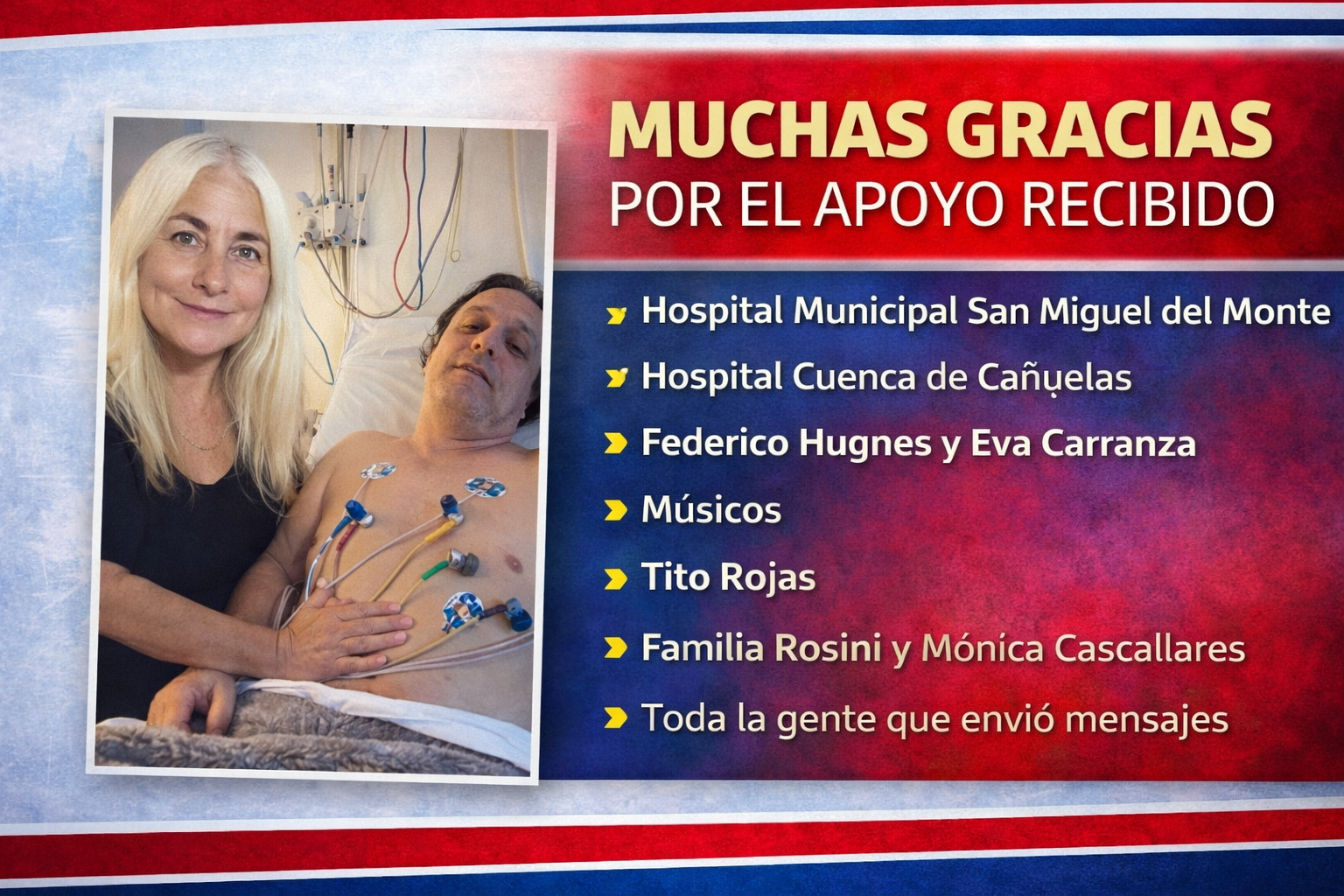 A Tito Rojas, a la familia Rosini, a Mónica Cascallares que se acercaron hasta el hospital, y a toda la gente que se preocupó y envió mensajes de aliento por redes sociales y WhatsApp.