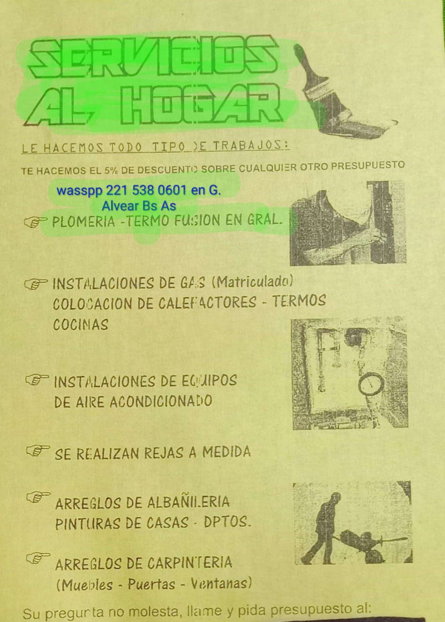 Servicio al Hogar: Nuevo Emprendimiento Alvearense Un Grupo de Alvearenses ofrece a la Comunidad un «Servicio al Hogar», conozca sus trabajos y beneficios.- Y para jubilados y con alguna incapacidad se le hace un 10% de descuento.- Spread the love