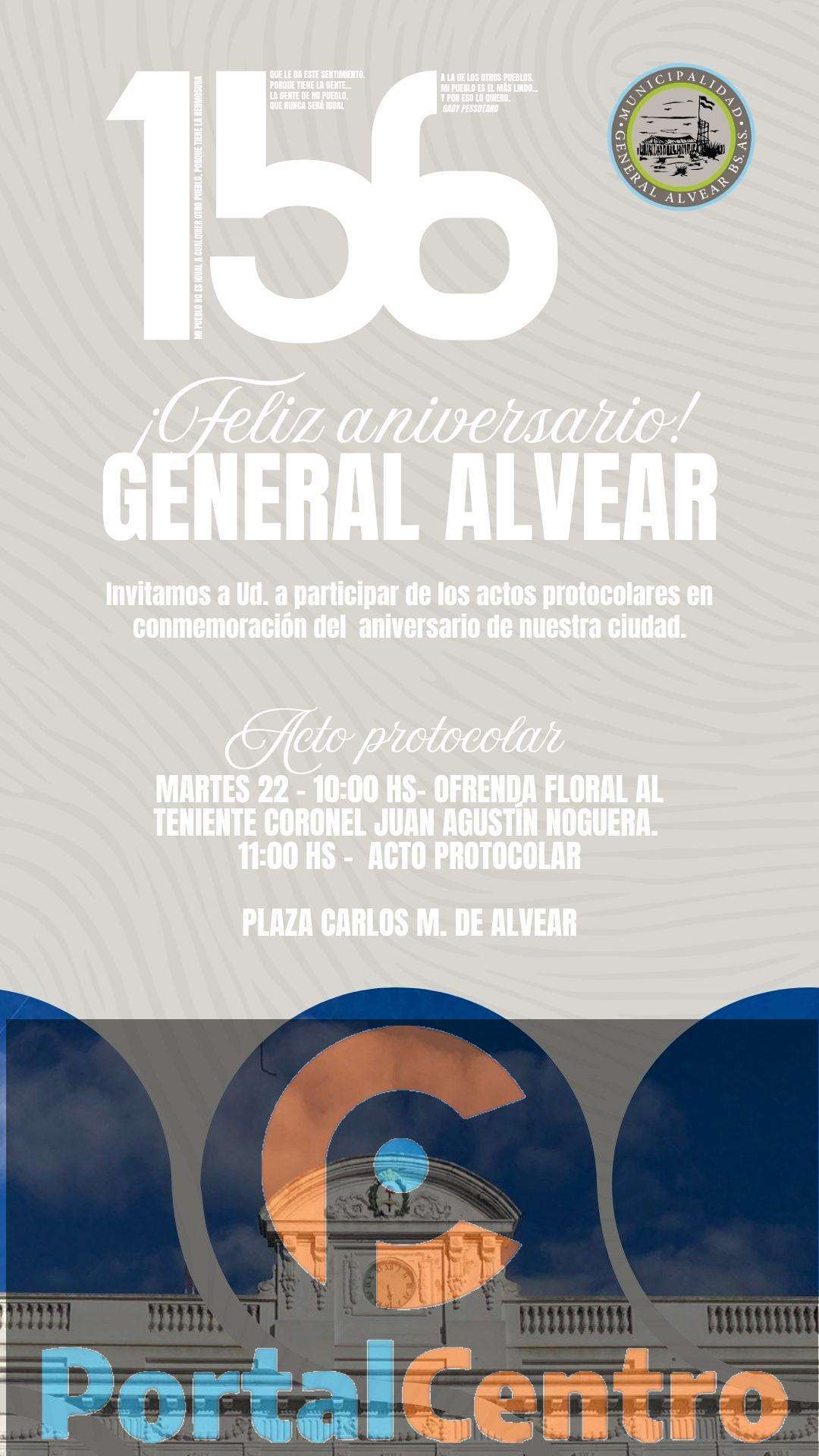 MARTES 22 DE JULIO: OFRENDA FLORAR Y ACTA POR EL 156° DE GENERAL ALVEAR Se invita a toda la comunidad a participar de la celebración por un nuevo aniversario de la fundación de nuestro partido. Este Martes 22 de Julio a las 10.00 horas se llevará a cabo una ofrenda floral en el monumento al Teniente Coronel Juan Agustín Noguera. Posteriormente a las 11.00 horas se realizará el acto protocolar en la plaza principal de nuestra ciudad. Celebremos juntos los 156 años de nuestro querido General Alvear. Spread the love