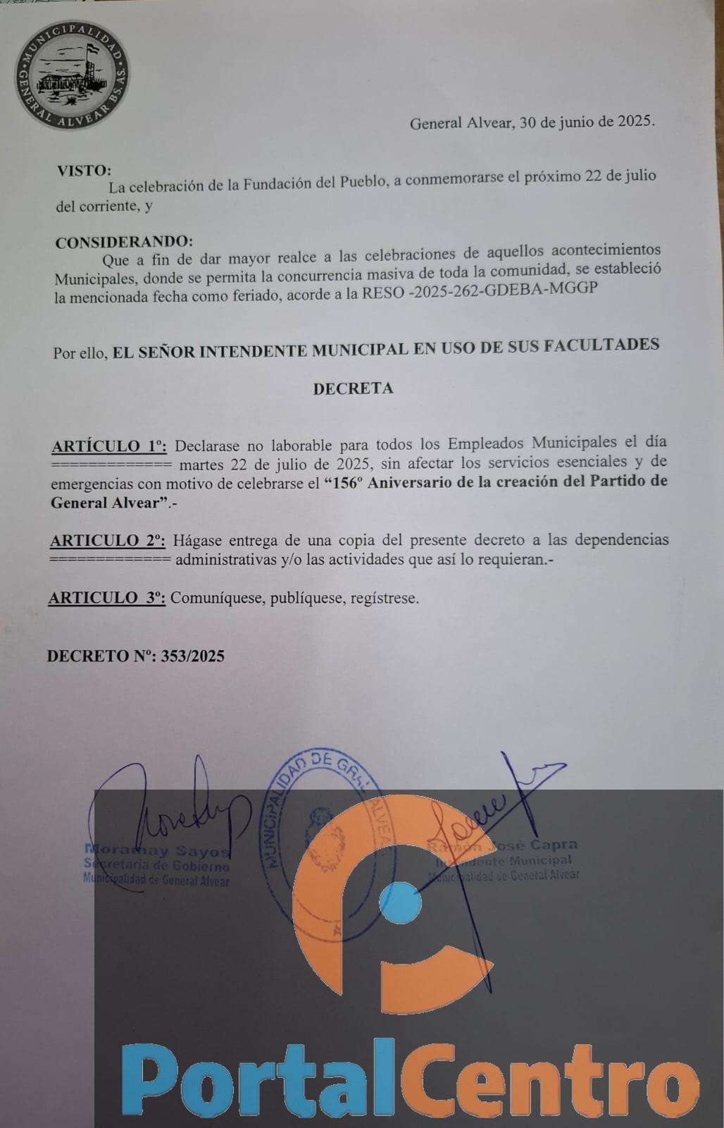 Asueto Administrativo por el Aniversario del Partido de Gral. Alvear La Municipalidad de General Alvear, pone en conocimiento de los vecinos que, al celebrarse el 156º Aniversario de la creación de nuestro partido, el día martes 22 de Julio se declara día no laborable para la administración municipal, sin afectar los servicios esenciales. Se invita a la Industria, el Comercio, Entes Provinciales y Nacionales (SENASA, PAMI, IOMA, ARBA, ANSES) y restantes actividades, no estatales, a que se unan a tan importante celebración. Resolución Nº 2025-22045434-GDEBA-SSAMMGGP del Gobierno de la Provincia de Buenos Aires y adhesión mediante Decreto Nº 353/2025 del Ejecutivo Municipal. Spread the love