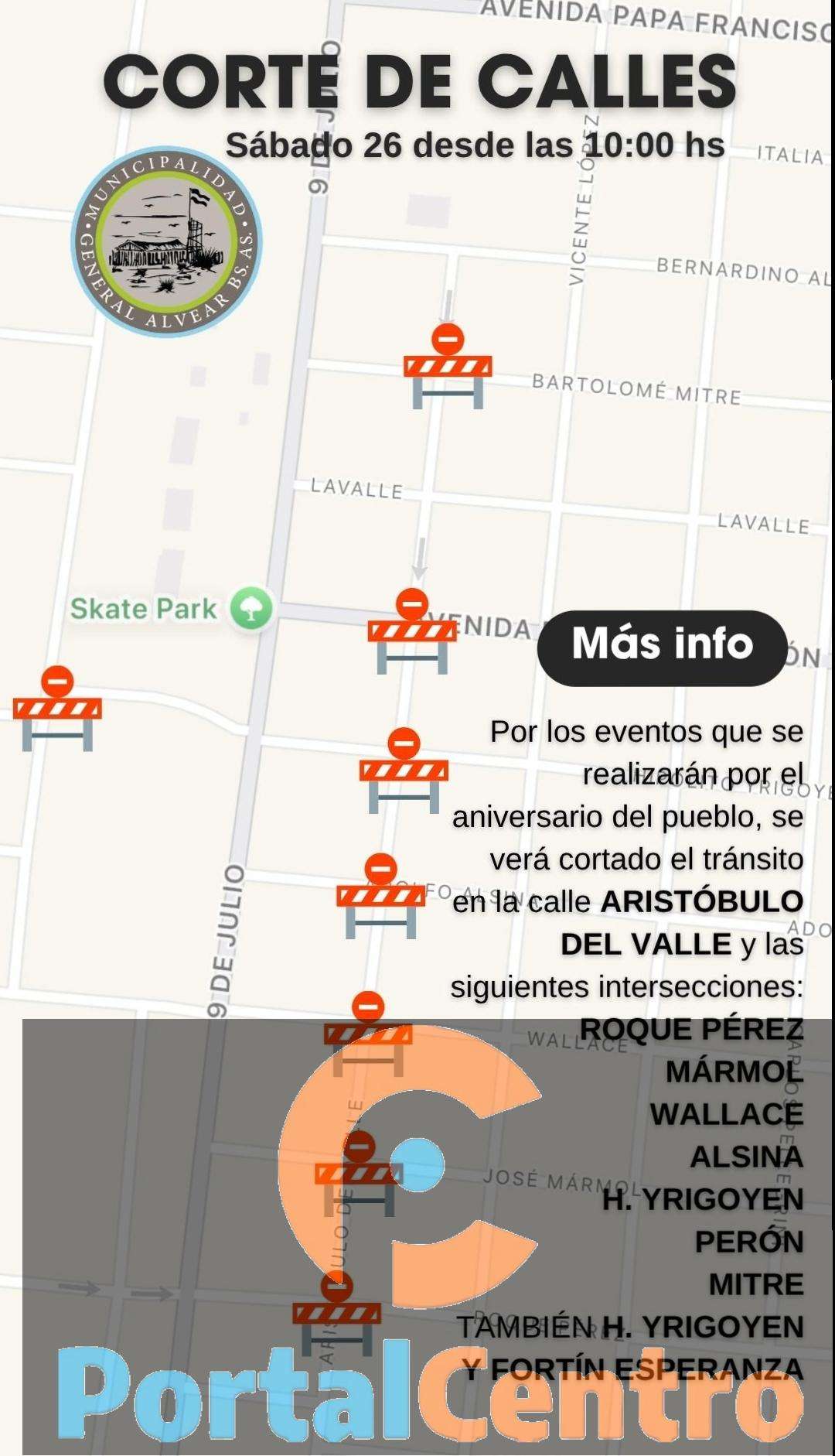 Cortes de Calles por el Festejo del Aniversario de General Alvear Con motivo de los. 156° Aniversario de General Alvear, desde la Municipalidad se dió a conocer en circuito de transito y cortes de Calles que se realizarán durante los días Sábado 26 y Domingo 27 de Julio.- Cortes en: ARISTÓBULO DEL VALLE y las siguientes intersecciones: WALLACE Y ROQUE PÉREZ; WALLACE ALSINA; JOSÉ MAROL E YRIGOYEN; PERÓN – MITRE; TAMBIÉN H. YRIGOYEN Y FORTÍN ESPERANZA Spread the love