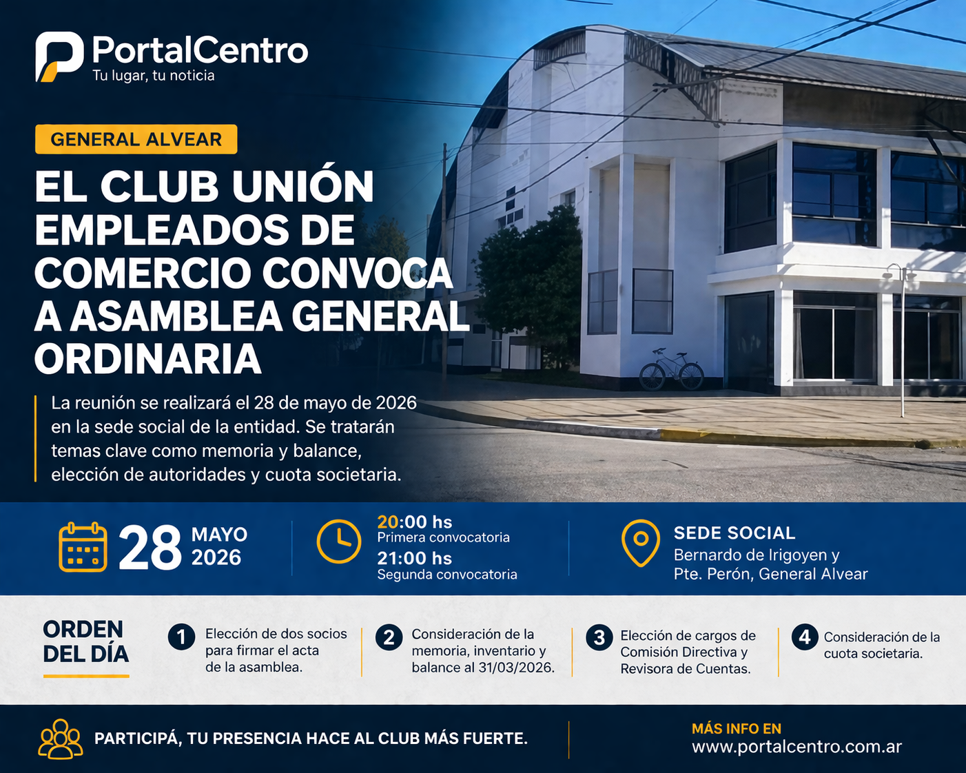 La Comisión Directiva del Club Unión Empleados de Comercio informó la convocatoria a la Asamblea General Ordinaria, que se llevará a cabo el próximo 28 de mayo de 2026 en la sede social de la institución, ubicada en la intersección de Bernardo de Irigoyen y Presidente Perón.