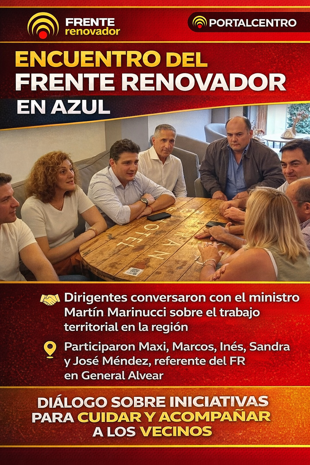 En el marco de una visita a la ciudad de Azul, dirigentes y referentes del Frente Renovador participaron de un encuentro junto al ministro Martín Marinucci, donde se abordaron distintas temáticas vinculadas al trabajo territorial y las políticas públicas en la región.