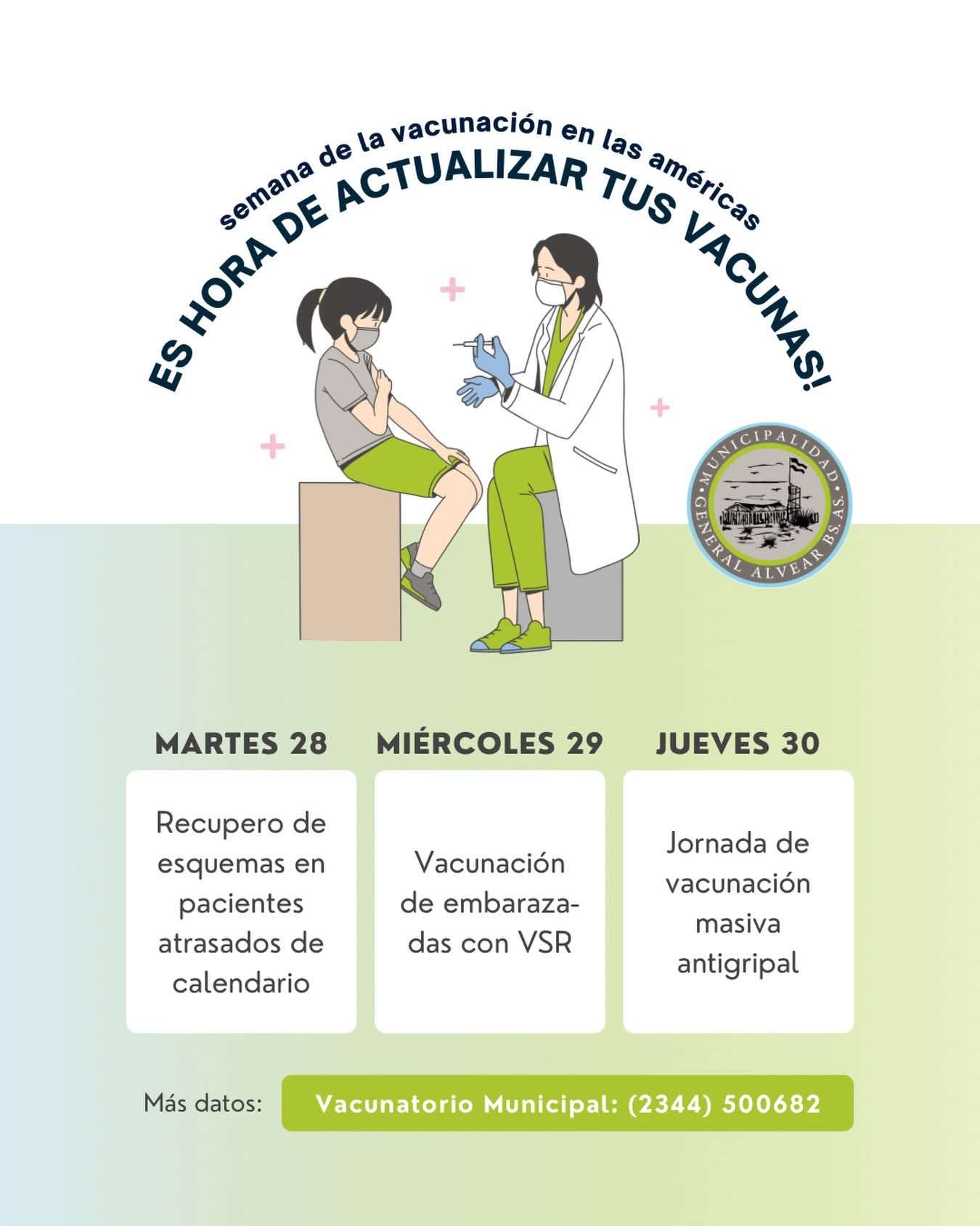 La Municipalidad de General Alvear informó el cronograma de actividades en el marco de la Semana de la Vacunación en las Américas, una iniciativa destinada a promover la prevención y el cuidado de la salud a través de la inmunización.