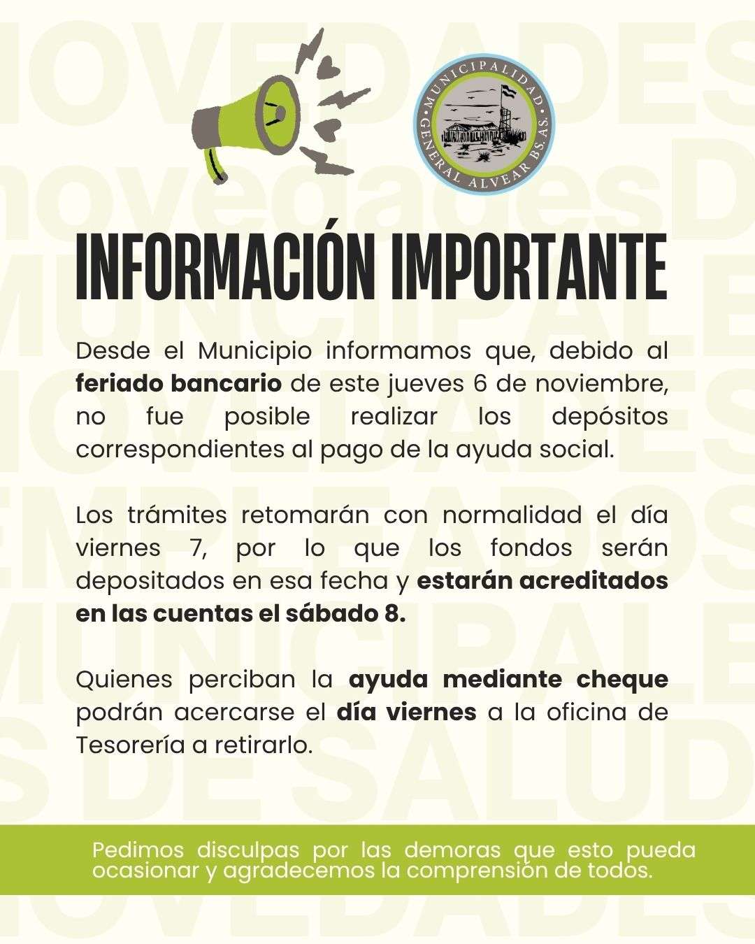 Desde el Municipio informamos que, debido al feriado bancario de este jueves 6 de noviembre, no fue posible realizar los depósitos correspondientes al pago de la ayuda social.