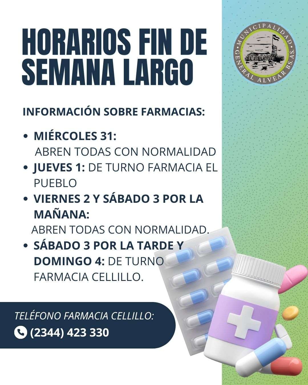 SÁBADO 3 POR LA TARDE Y DOMINGO 4: DE TURNO FARMACIA CELLILLO.
