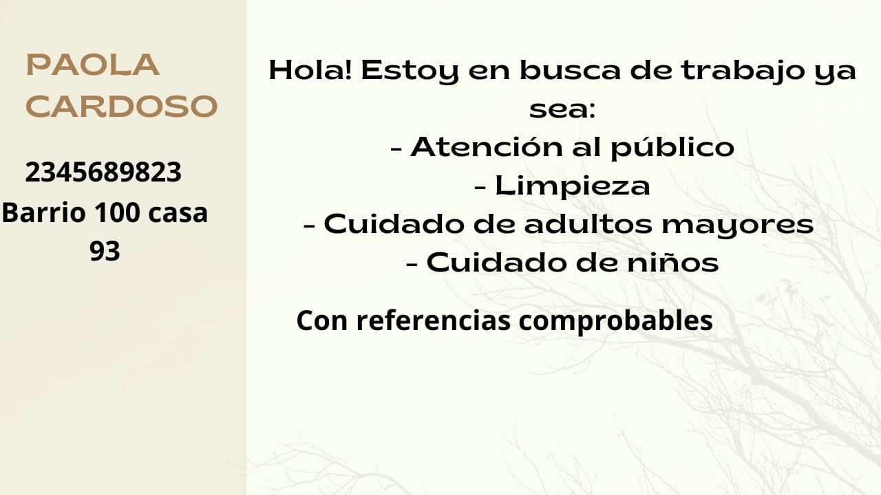 Mi Nombre es Yasmin Aranda ando en busca de trabajo ya sea para el cuidado de abuelos (en hospital o domicilio particular )niños , también para limpieza por hora en este cuento con referencias comprobable , cualquier cosita que sepan comunicarse a este número: 2345-659636 desde ya muchas gracias..