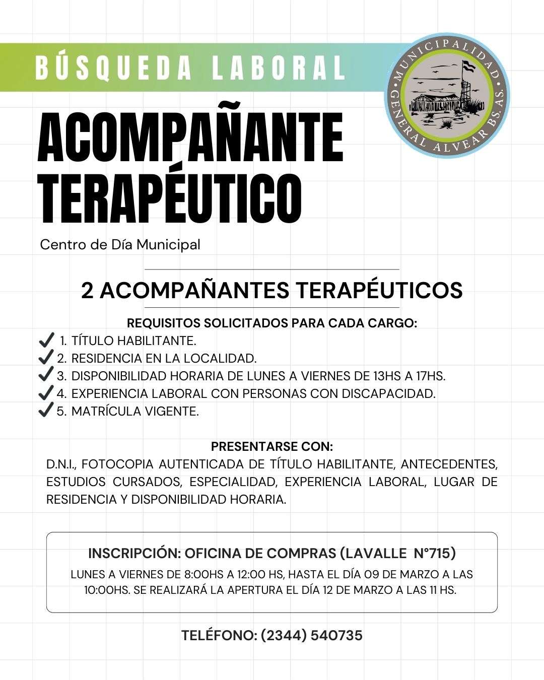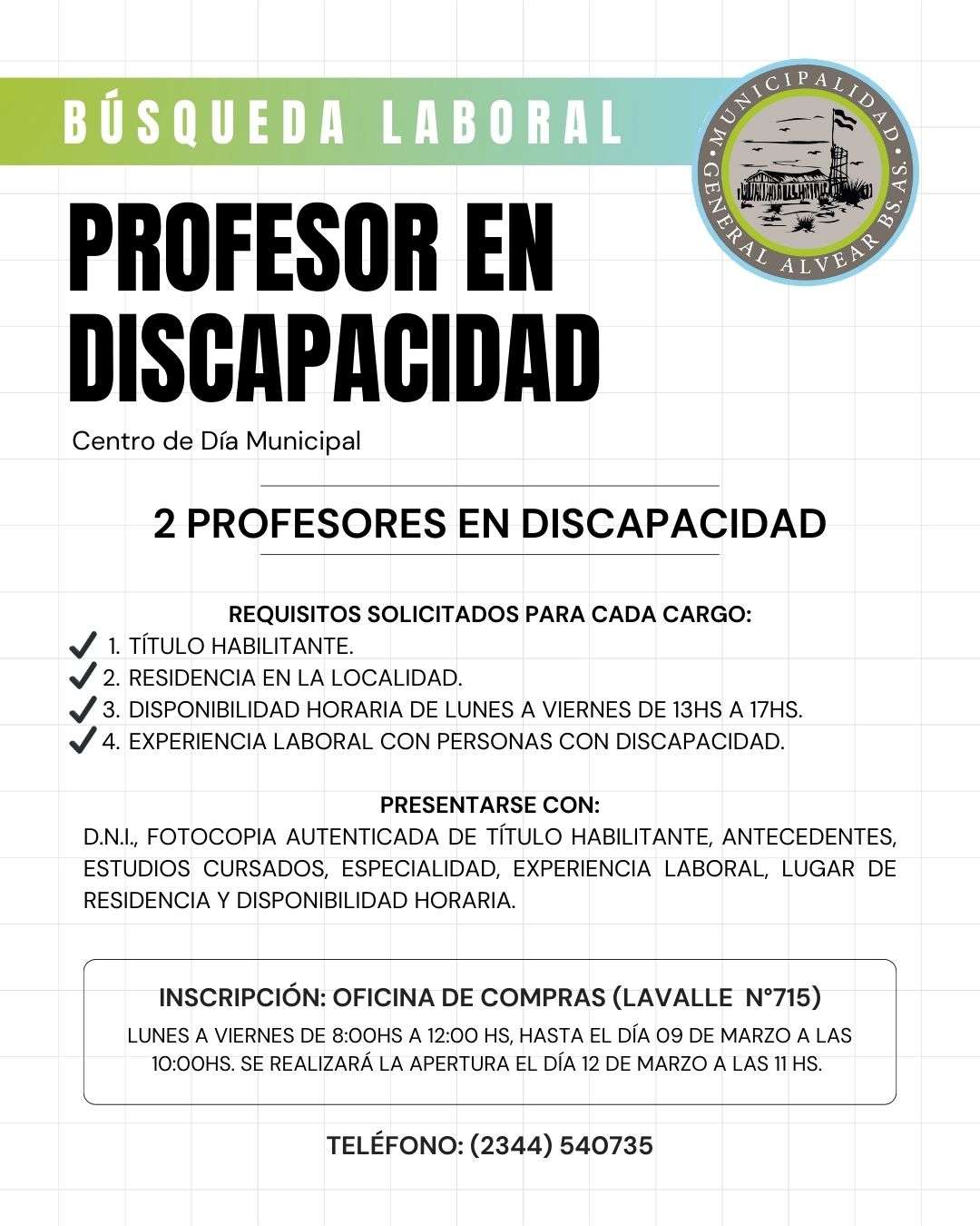 Desde el Municipio se informa que está Abierta la Licitación para empleo de Profesionales en el Centro de Dia, para cubrir las siguientes vacantes: