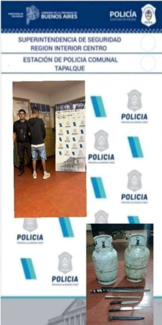 Parte de Prensa: Con fecha 09/01/2026 raíz llamado telefónico 911, se toma conocimiento de conflicto familiar en domicilio de este medio, se constituye personal EPC Tapalqué, donde propietario del inmueble se torna agresivo, dañando la vivienda, dirigiendo amenazas de muerte con arma blanca al personal policial, y su ex pareja, procediendo a la aprehensión del mismo. Elementos recogidos.