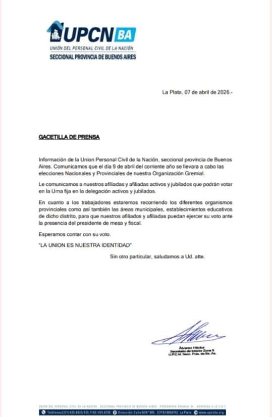 Desde la Unión del Personal Civil de la Nación (UPCN), seccional provincia de Buenos Aires, informaron mediante una gacetilla de prensa que el próximo 9 de abril de 2026 se llevaran a cabo las elecciones nacionales y provinciales de la organización gremial.